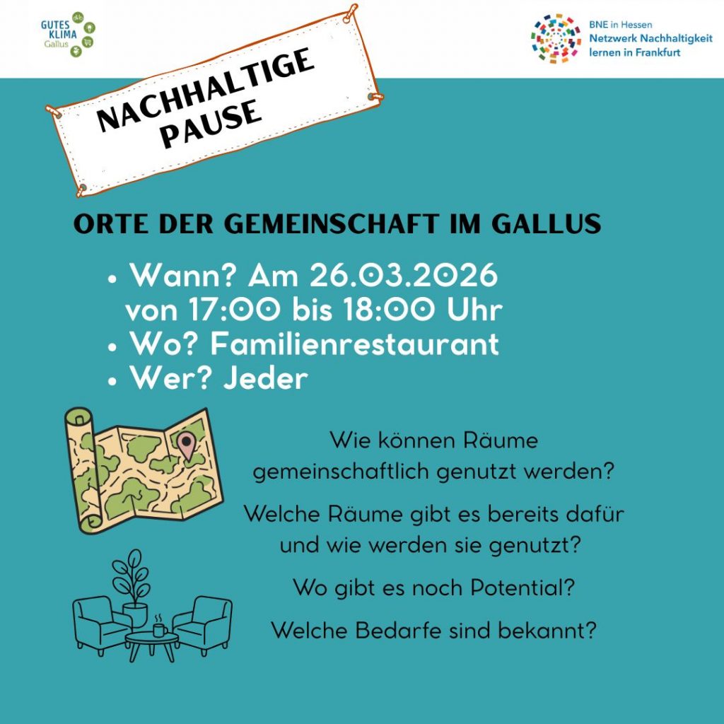Regelmäßig (1*im Monat) bieten wir eine kurze „Nachhaltige Pause“ an. Immer ein anderes Thema durch unterschiedliche Personen, kurz und praktisch. Wir freuen uns immer über eine kurze Anmeldung bis zum Mittag am Tag davor. Du hast auch eine Idee für eine nachhaltige Pause? Dann melde dich gerne 🙂