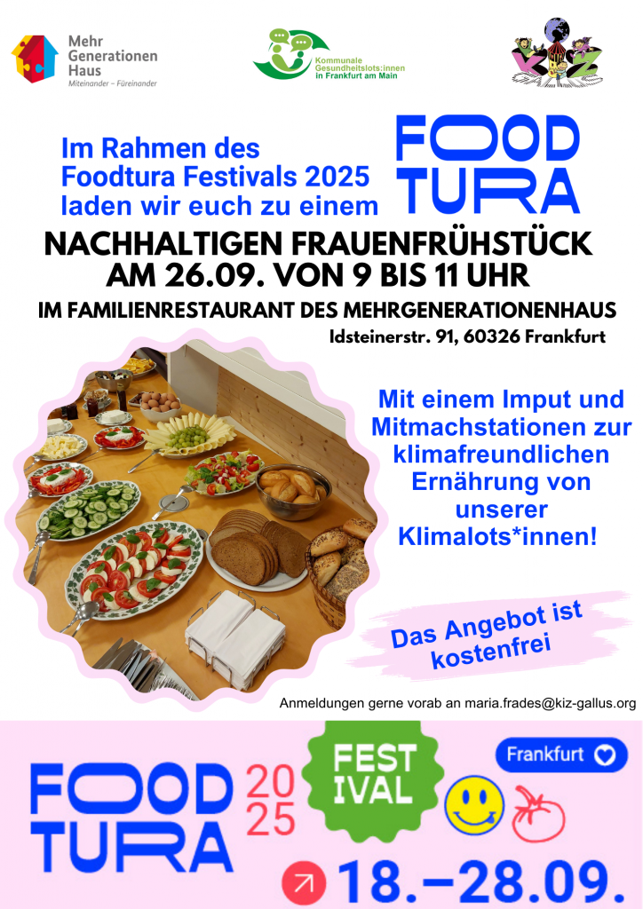 Im Rahmen des Foodtura Festivals organisiert von Klimagourmet und Initiative Gastronomie Frankfurt e. V. öffnen wir unseren wöchentlichen Frauenfrühstückstreff am 26.09. für neugierige Frauen, die uns kennenlernen wollen und Lust auf ein gesundes, leckeres und nachhaltiges vegetarisches Frühstück haben und gerne in den Austausch mit anderen Frauen kommen möchten.